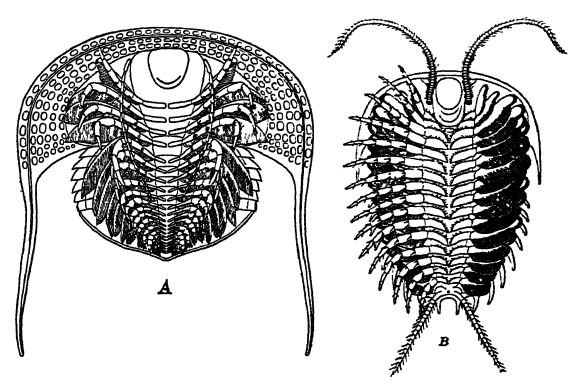. Les trilobites sont les crustacés les plus primitifs et l’on suppose généralement qu’ils descendent d’un annélide à plusieurs segments, au Protérozoïque. Cependant, Raymond a récemment émis l’hypothèse que l’ancêtre des trilobites était un animal à corps mou, aplati, flottant et nageant, ressemblant à un ver, composé de quelques segments, probablement doté d’yeux marginaux simples, voire aveugles, avec une bouche située sous le bord antérieur, des organes tactiles à une ou aux deux extrémités, une forme ovale et un tube digestif droit et étroit reliant la bouche antérieure à l’anus terminal.