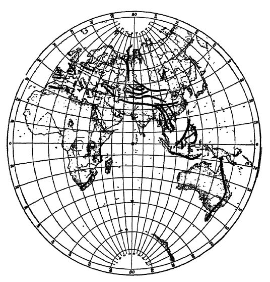 Alpes paléozoïques d’Europe. — La fin de l’Ilissippien et le Pennsylvanien furent des périodes de mouvements crustaux marqués, entraînant des changements profonds dans la répartition des terres et des mers. En Europe centrale et occidentale, ces mouvements commencèrent peu après la fin du Culm, reprirent au Carbonifère supérieur, puis au Permien. Au cœur de l’Europe se forma une imposante chaîne de montagnes plissées, les Alpes paléozoïques d’Europe, dont les vestiges de roches massives sont encore visibles aujourd’hui en Allemagne, en France, en Belgique, en Angleterre et en Irlande (voir carte, p. 352 ; leur répartition générale est illustrée dans la figure, p. 387, de la partie I). Les chaînes occidentales, s’étendant de l’Irlande au plateau central français en passant par le Pays de Galles et le sud de l’Angleterre (le système des Mendip), furent nommées Montagnes armoricaines par Suess. Les chaînes orientales s’étendant du sud de la France, à travers les Vosges et la Forêt-Noire, jusqu’à la forêt de Thuringe, le Harz, le Fichtelgebirge, la Bohême et les Sudètes, et peut-être même plus à l’est, sont appelées les Alpes varisques. Des montagnes se sont également formées dans les Pyrénées, le plateau espagnol, la Corse, la Sardaigne et les Alpes. Le plissement de l’Oural a lui aussi débuté à la fin du Carbonifère et a atteint son apogée au Permien. On retrouve même, en Arménie, en Asie centrale et orientale (Altaï, Tianshan, etc.), en Afrique du Sud, en Australie et dans les Andes, les traces des mouvements tectoniques de cette époque (voir fig., p. 368).