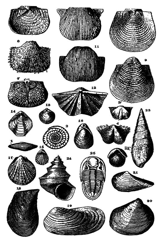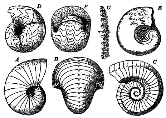 Les brachiopodes sont les fossiles les plus courants du Pennsylvanien dans ce pays, mais ils étaient progressivement remplacés par les bivalves. Ce même changement faunique s’est [ p. 366 ] également produit en Europe du Nord, mais dans la région méditerranéenne (appelée Téthys), qui s’étend de la Sicile à l’Inde, les eaux regorgeaient encore de brachiopodes au Permien. Tandis que les brachiopodes disparaissaient, les céphalopodes à coquille des familles des goniatides et des ammonides se transformaient rapidement en une variété de formes caractéristiques du Permien (voir Fig. ci-dessous).