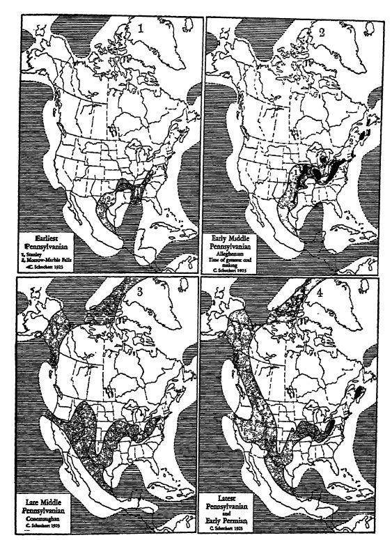 Submersions. — L’histoire géologique de la partie intérieure ou bassinée de l’Amérique du Nord au Pennsylvanien ne présentait pas de plissement crustal, bien que des déformations locales fussent fréquentes, entraînant des submersions périodiques en eaux peu profondes. Dans les États de la Nouvelle-Angleterre et les provinces maritimes du Canada, cependant, les géoclinaux se sont soulevés verticalement, donnant naissance à des montagnes à différentes époques. La croûte était également plissée dans les États du sud de la région centrale intérieure (principalement l’Arkansas, l’Oklahoma et le Texas), et enfin, vers la fin du Pennsylvanien, toutes ces régions, à l’exception des Appalaches et du sud-est des montagnes Rocheuses, étaient en pleine formation de montagnes. Ces mouvements seront décrits plus loin et ne sont mentionnés ici que pour souligner que les principales parties centrales de l’Amérique du Nord, et principalement les États-Unis, étaient une région de déformations crustales uniquement. Les eaux du Pacifique pénétraient dans les zones affaissées.