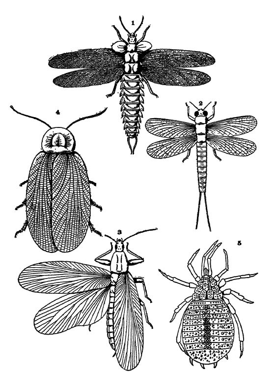 On connaît aujourd’hui environ 1 300 espèces d’insectes provenant des strates du Pennsylvanien et du Permien inférieur. Elles restent rares dans le Pennsylvanien inférieur, mais sont communes dans les tiers moyen et supérieur de cette structure. Les formes les plus anciennes, connues sous le nom de Palseodictyoptera (170 espèces), étaient particulièrement répandues au Pennsylvanien et ont toutes disparu au cours du Permien (voir Pl., p. 363, Fig. 1 et 2). Ces insectes étaient généralement de grande taille et de structure primitive, et menaient une vie amphibie, leur stade larvaire se déroulant dans l’eau. Ils n’étaient généralement pas carnivores, mais leur puissante bouche broyeuse laisse supposer qu’ils se nourrissaient de plantes et de matières animales mortes ou en décomposition. Ils possédaient quatre ailes droites et identiques, qui se projetaient latéralement comme celles des libellules modernes et ne pouvaient se replier sur l’abdomen comme chez la plupart des insectes actuels. Le thorax comportait trois grands segments, suivis d’un abdomen long et fin dont les segments étaient identiques, se terminant par deux longs cerques ou appendices reliés aux organes respiratoires, comme chez les éphémères actuelles. Leurs yeux étaient composés et leurs antennes simples.