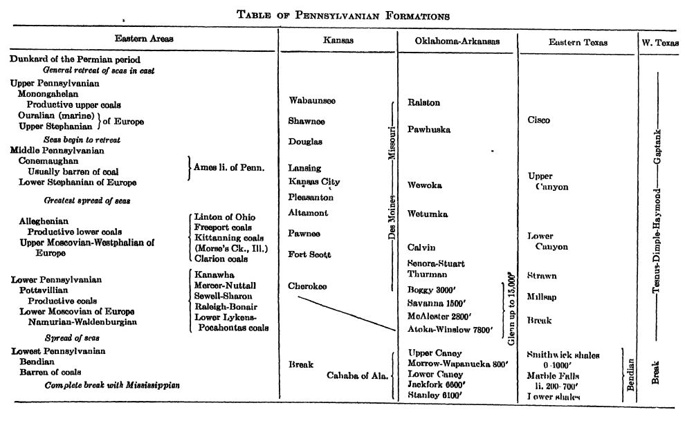 Le pétrole étant d’origine organique, et principalement végétale, il est naturel que les formations houillères en soient également riches. Dans les régions montagneuses, cette substance volatile s’est dissipée depuis longtemps par le plissement et la fracturation des strates pennsylvaniennes. Dans les vallées de l’Ohio et du Mississippi, le pétrole est également peu abondant, probablement parce que ces mêmes strates affleurent, permettant ainsi aux gaz et au pétrole de s’échapper dans l’atmosphère. En revanche, les champs pétrolifères du centre du continent, au Kansas, en Oklahoma et dans le centre-nord du Texas, recèlent d’immenses richesses en hydrocarbures. Au Kansas, les gisements se trouvent principalement dans les couches profondes du Mississippien, tandis qu’en Oklahoma et au Texas, ils se situent à différents niveaux dans le Pennsylvanien. Pour plus de détails, voir le chapitre XX.