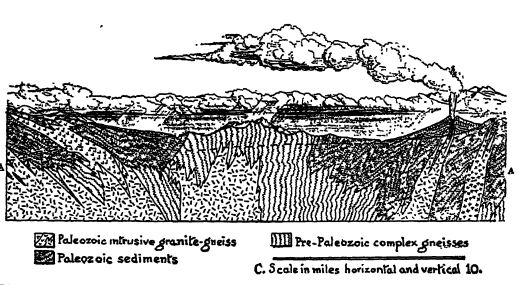 Révolution des Appalaches. — Il a été mentionné plus haut dans ce chapitre qu’à l’exception des États du sud-ouest, les mers commencèrent à disparaître vers la fin du Pennsylvanien, et qu’à la fin du Permien inférieur, le continent avait de nouveau émergé presque entièrement de la mer. Pendant une longue période, on ne trouve aucune trace d’autre érosion continentale. Au cours de l’ère paléozoïque précédant le Pennsylvanien, le continent connut quatre phases de formation de montagnes. Aucune de ces déformations, cependant, n’eut l’ampleur d’une révolution (voir p. 91). Chacun de ces mouvements crustaux, à son tour, plissa une partie des Appalaches et, finalement, également les monts Llanoris de Louisiane et du Texas. Puis, dans ces mêmes régions, se produisirent les différentes orogenèses du Pennsylvanien, décrites précédemment, auxquelles s’ajouta l’agitation crustale des montagnes Rocheuses ancestrales. Il y eut probablement d’autres zones de mouvement le long de la frontière pacifique, en Californie et dans la région de Washington-Vancouver (voir figures, pp. 352 et 368). Des volcans étaient alors actifs de la Californie à l’Alaska.
