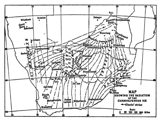 L’Afrique du Sud possède les tillites permiennes les mieux connues, et Du Toit en a rassemblé les preuves en 1921. L’ensemble d’Airica et de Madagascar, au sud des 22e et 23e parallèles respectivement, était recouvert de calottes glaciaires dont l’épaisseur maximale variait entre 1 200 et 1 500 mètres. On distinguait deux grands et deux petits centres d’accumulation de neige qui, en fusionnant, se sont [ p. 429 ] déplacés vers le sud-ouest et vers le sud, jusqu’aux océans. Les hautes terres se situaient au nord et surtout au nord-est, culminant à environ 1 200 mètres d’altitude. La calotte glaciaire du Transvaal était la plus étendue, s’étendant sur au moins 1 100 kilomètres vers le sud-ouest. Les tillites de la série de Dwyka ont une épaisseur inférieure à 30 mètres au nord-est, mais atteignent 450 mètres au sud et 600 mètres dans le sud du Karoo (voir fig., p. 428).