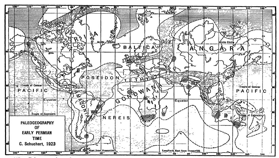 Cause de la glaciation permienne. — Les causes de ce changement climatique majeur au Permien, et notamment son confinement apparent à l’hémisphère sud, demeurent des questions non résolues. La plupart des géologues cherchent l’explication dans les profonds bouleversements des courants atmosphériques et océaniques provoqués par l’intense agitation crustale survenue au Pennsylvanien et au Permien, comme en témoignent les imposantes chaînes de montagnes qui se sont formées sur différents continents à cette époque (Fig., pp. 352 et 368). [ p. 430 ] Un autre facteur ayant probablement joué un rôle important dans l’apparition de ce climat glaciaire fut l’immense Antarctique, qui s’est alors apparemment uni à l’Australie d’un côté et à l’Amérique du Sud de l’autre. Naturellement, de tels bouleversements et ces connexions terrestres ont également dû modifier les courants océaniques.