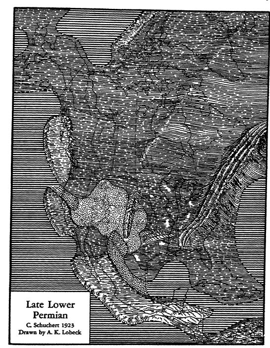 Disparition des mers épicontinentales du Paléozoïque. — Nous avons vu qu’à la fin du Pennsylvanien, une mer très peu profonde, venant du sud et de l’ouest, s’étendait de façon oscillante à travers les États-Unis jusqu’au centre de la Pennsylvanie. Ces eaux ont commencé à se retirer vers la fin de cette période, bien que des eaux saumâtres fussent encore présentes, dans une certaine mesure, au début du Permien dans le sud-est de l’Ohio, comme en témoignent les requins de la formation de Dunkard. On connaît également de très faibles traces d’eau douce permienne près de Danville, dans l’Illinois, qui remplissent une ancienne vallée fluviale. Par ailleurs, aucune trace de formation rocheuse de cette période n’est connue dans toute la moitié est de l’Amérique du Nord, et nous verrons que cette situation, largement répandue, persiste jusqu’à nos jours.