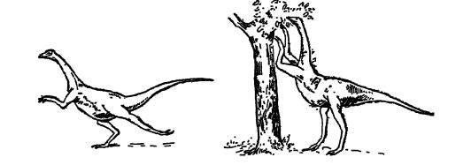 Parmi les dinosaures carnivores que nous venons de décrire, une espèce plus légère et plus proche des oiseaux a évolué, en adaptation à un régime alimentaire différent et à un mode d’alimentation différent. Cette espèce a finalement donné naissance, au Crétacé supérieur, au Struthiomimus (« semblable à l’autruche »). Cet animal élancé possédait de très longues pattes, des pieds à trois orteils semblables à ceux des oiseaux, un cou long et fin, un petit crâne et des mâchoires dépourvues de dents, mais dotées d’un bec arrondi comme celui d’une autruche. Ses membres antérieurs étaient relativement longs, avec des doigts fins et allongés se terminant par des griffes droites et arrondies. On ignore de quoi se nourrissaient ces animaux, à moins qu’il ne s’agisse de fruits, de très petits reptiles et d’insectes (voir fig. ci-dessus).