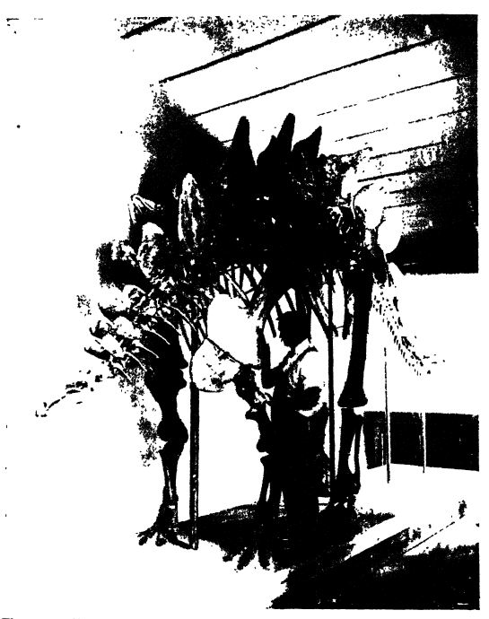 Le Stegosaurus avait un corps résolument trapu, aux flancs massifs. Sa tête était ridiculement petite, avec un bec semblable à celui d’une tortue, tandis que ses dents postérieures ressemblaient à celles des dinosaures à bec de canard. La taille relativement réduite de son cerveau est également mentionnée à la page 494. (Voir Fig., p. 488.)