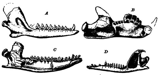 Mammifères archaïques. — L’apparition des mammifères reptiliens est mentionnée dans le chapitre du Trias, et leurs ossements fragmentaires, notamment des dents et des mandibules, sont retrouvés dans divers gisements du Mésozoïque. C’étaient de petites créatures énigmatiques, et aucune ne pouvait rivaliser avec un dinosaure. En Angleterre, on les trouve à la fin du Jurassique et au Crétacé inférieur, et en Amérique dans la formation de Morrison (Fig. ci-dessus). On sait encore peu de choses sur ces animaux, si ce n’est que les espèces américaines et européennes étaient très semblables et qu’elles appartenaient au groupe des mammifères les plus primitifs, les Multituberculés. Il est probable que les mammifères du Mésozoïque étaient, pour la plupart, ovipares.