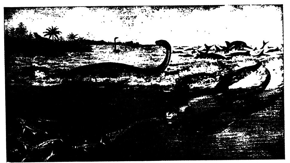 Un autre groupe de reptiles marins carnivores était celui des Plesiosauria (du grec « presque-lézard »), apparu au Trias et ayant culminé au Jurassique, et qui offrait un contraste saisissant avec les ichtyosaures (Fig., p. 519). Chez le genre type, Plesiosaurus, la tête était relativement petite et les mâchoires étaient pourvues de grandes dents acérées, logées dans des alvéoles distinctes. Le cou était extrêmement long, fin et serpentiforme, et se démarquait nettement du petit corps trapu. Les nageoires étaient beaucoup plus grandes que chez les ichtyosaures et jouaient probablement un rôle plus important dans la locomotion. Les espèces jurassiques de Plesiosaurus ne dépassaient guère six mètres de long. En 1920, un plésiosaure de près de deux mètres de long fut découvert dans des dépôts d’eau douce du Crétacé inférieur (Wealden, en Angleterre). On y voit un vestige du Jurassique et un exemple d’une forme d’ascendance marine s’adaptant à un environnement d’eau douce.