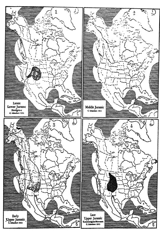 L’Amérique du Nord, en revanche, contraste fortement avec l’évolution du Jurassique européen, car les trois quarts de sa partie orientale ont été marqués par l’érosion et la pénéplanation. Ce n’est que le long de la frontière pacifique que l’océan a envahi les terres, s’étendant pendant une période limitée vers l’est jusqu’au Wyoming et au Colorado. On dénombre probablement moins de 600 espèces de fossiles jurassiques en Amérique du Nord, tandis que l’Europe en a livré près de 15 000.