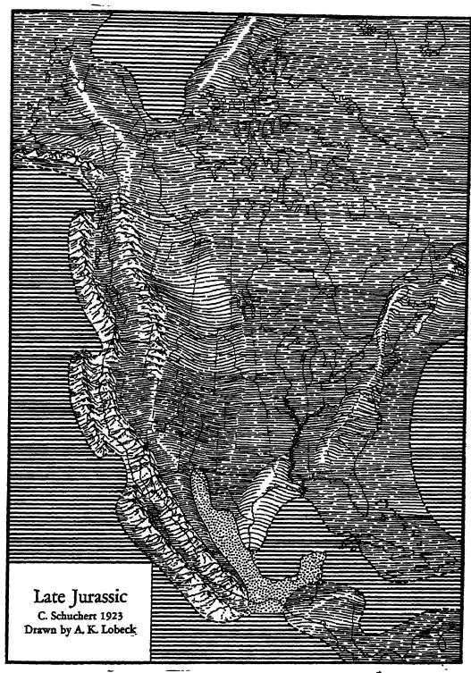 Cycle d’érosion jurassique. — Dans un chapitre précédent, nous avons vu que le Trias, dans l’est de l’Amérique du Nord, s’est achevé avec le soulèvement des Palisades, un mouvement qui a engendré la formation de massifs montagneux probablement aussi hauts que la Sierra Nevada actuelle. Le Jurassique a donc débuté dans cette région par une érosion active, et les dépôts continentaux formés à cette époque ont été transportés dans les bassins océaniques. Ainsi, le Jurassique, sur la majeure partie de l’Amérique du Nord, a été une période d’érosion sans trace de mer, et la formation de Morrison est la seule d’origine d’eau douce. Tous les sédiments ont été déversés dans l’Atlantique, bien au-delà des marges est et sud actuelles du continent. Ce cycle d’érosion a entraîné la transformation finale de l’ancien relief des hautes Appalaches et des basses Palisades en un terrain presque plat, et c’est cette pénéplanation qui a préparé le terrain pour le prochain recouvrement de l’océan Atlantique, au Crétacé.
