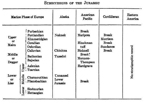 Il est intéressant de faire une petite digression ici et de noter que, dans ce dernier pays, le Jurassique traverse cinq cycles de dépôt sédimentaire, c’est-à-dire que les roches passent cinq fois par le cycle des strates arénacées, argileuses puis calcaires (Geikie). On a longtemps cru que les périodes devaient être basées sur les cycles sédimentaires, mais l’erreur de cette conclusion apparaît clairement dans le fait que le Jurassique lui-même comporte cinq cycles de ce type.