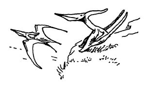 Les animaux les plus étranges des terres du Mésozoïque étaient sans doute les ptérodactyles, ou ptérosaures, qui régnaient sur les airs en ces temps médiévaux. « Avec leurs ailes déployées », explique Sir Richard Owen, le grand anatomiste comparatif, « [ils] devaient ressembler au Roc des romans arabes, mais avec des ailes de cuir surmontées de griffes recourbées et une gueule béante aux dents menaçantes. » Et selon un autre spécialiste britannique, H.G. Seeley, « Ces animaux [ p. 524 ] sont étonnants par leur anatomie. Leur aspect diffère de celui des oiseaux et des bêtes qui, à notre époque, planent au-dessus des terres et des mers. Ils réunissent dans le corps d’un seul individu des structures qui, de nos jours, comptent parmi les caractéristiques les plus distinctives de certains mammifères, oiseaux et reptiles. » Le cerveau, le système respiratoire, le sternum, la ceinture scapulaire et les os des membres des ptérodactyles étaient semblables à ceux des oiseaux. Leur crâne et leur colonne vertébrale présentaient une structure reptilienne, tandis que leurs os du bassin ressemblaient davantage à ceux des dinosaures. Leurs vertèbres cervicales étaient toujours au nombre de sept, ce qui les rapproche des mammifères. L’ensemble de ces caractéristiques témoigne des origines indépendantes des ptérodactyles et des oiseaux à partir de souches reptiliennes ou lézardiennes.