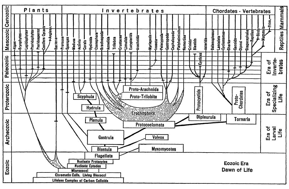 Géologie et Paléontologie. — On connaît aujourd’hui une grande variété de fossiles, et leur apparition au cours des temps géologiques (chronogenèse) a été déterminée. La géologie commence dans l’obscurité, en l’absence de tout fossile, mais ce manque même de traces organiques témoigne du caractère périssable des premières formes de vie et de leur incapacité à atteindre la complexité des organismes ultérieurs. Dans les strates plus récentes, en revanche, on trouve une abondance de fossiles, mais néanmoins, pendant longtemps, aucune trace de plantes terrestres n’est attestée, et la flore terrestre n’apparaît que plus tard.