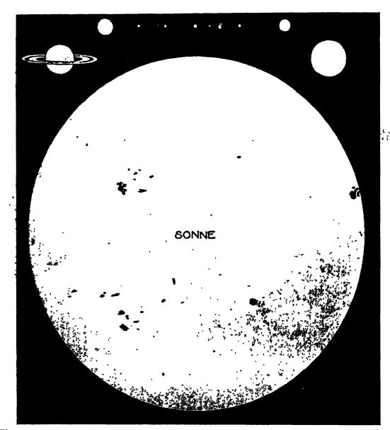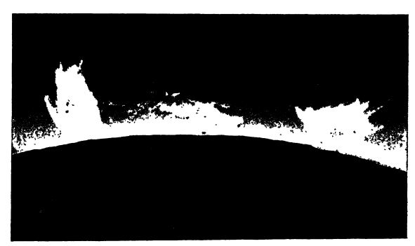 Hale décrit ainsi l’apparence du Soleil lors d’une éclipse totale : des flammes d’hydrogène, atteignant parfois des hauteurs de cinq cent mille kilomètres, s’élèvent d’une mer de flammes continue qui entoure complètement le Soleil (voir Fig., p. 113). Ce sont les protubérances, et la mer de flammes continue d’où elles émergent est la chromosphère. S’étendant bien au-delà de ces flammes dans l’espace, parfois à des millions de kilomètres, se trouve la couronne, qui brille d’un éclat argenté légèrement inférieur à celui de la pleine lune.